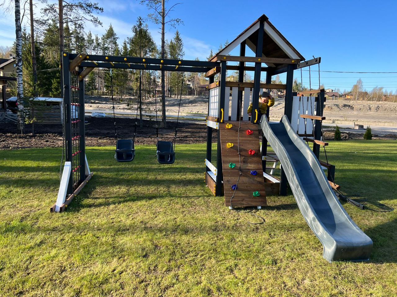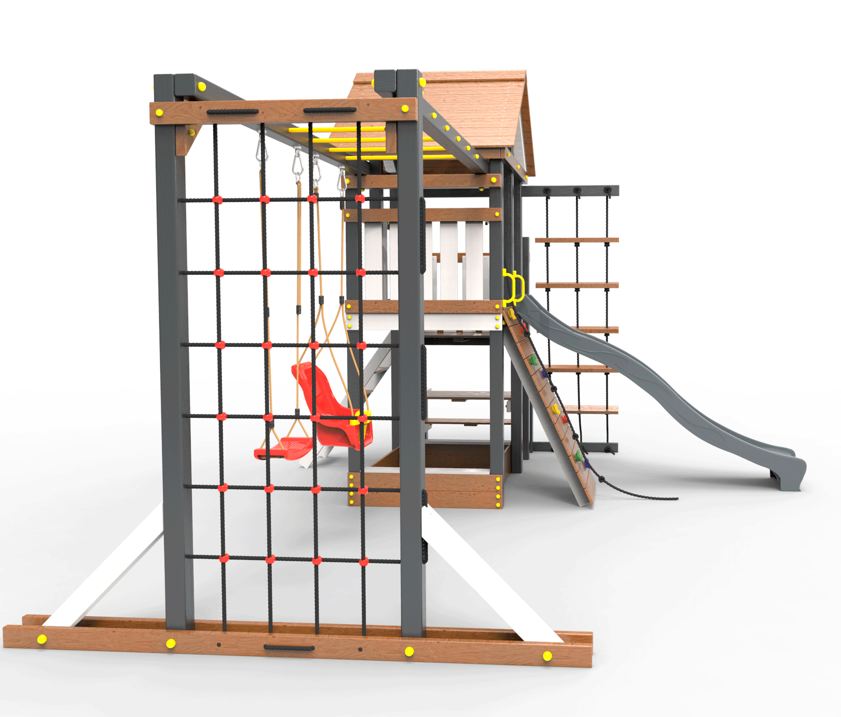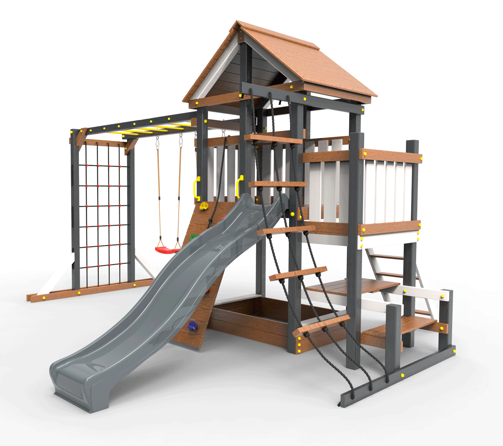 Обращаем Ваше внимание, что фактический цвет детской площадки может отличаться от представленных фото на сайте. Специфика окраски нетоксичными пропитками и красителями допускает отклонения в цветовой гамме отгружаемых изделий. Также обратите внимание, что фактический цвет может отличаться из-за цветопередачи устройства на котором Вы смотрите фото. Производитель оставляет за собой право менять цвет отдельных деталей и комплектующих(включая пластик, канаты и пр.), при этом сохраняя весь функционал и характеристики товара.